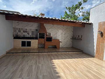 PAVIMENTO TÉRREO: SALA, COZINHA, BANHEIRO SOCIAL, ÁREA GOURMET COM CHURRASQUEIRA, ÁREA DE SERVIÇO E GARAGEM.