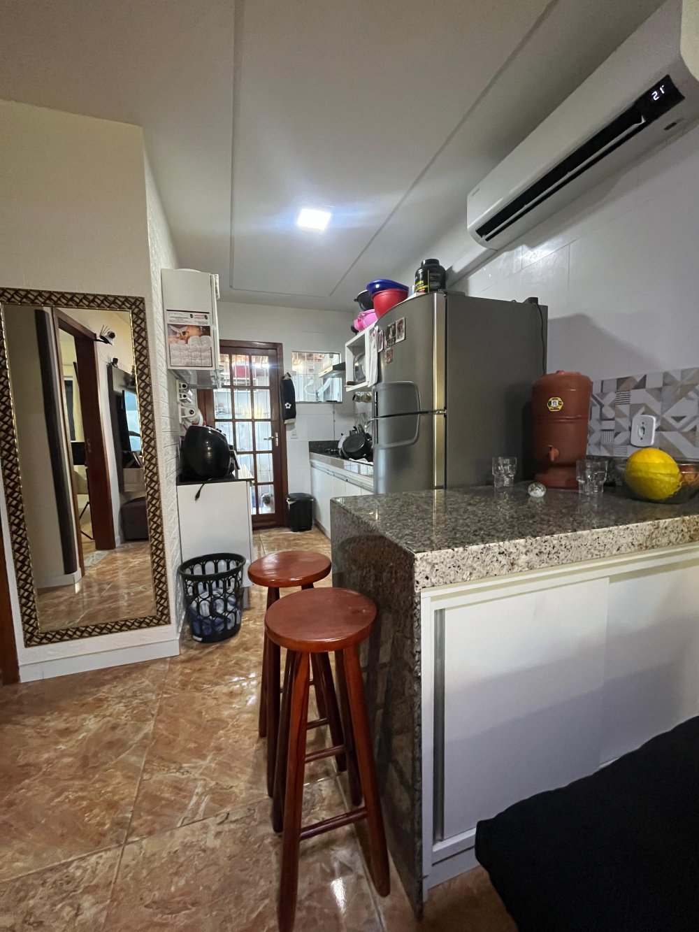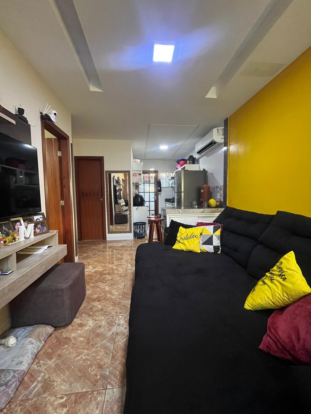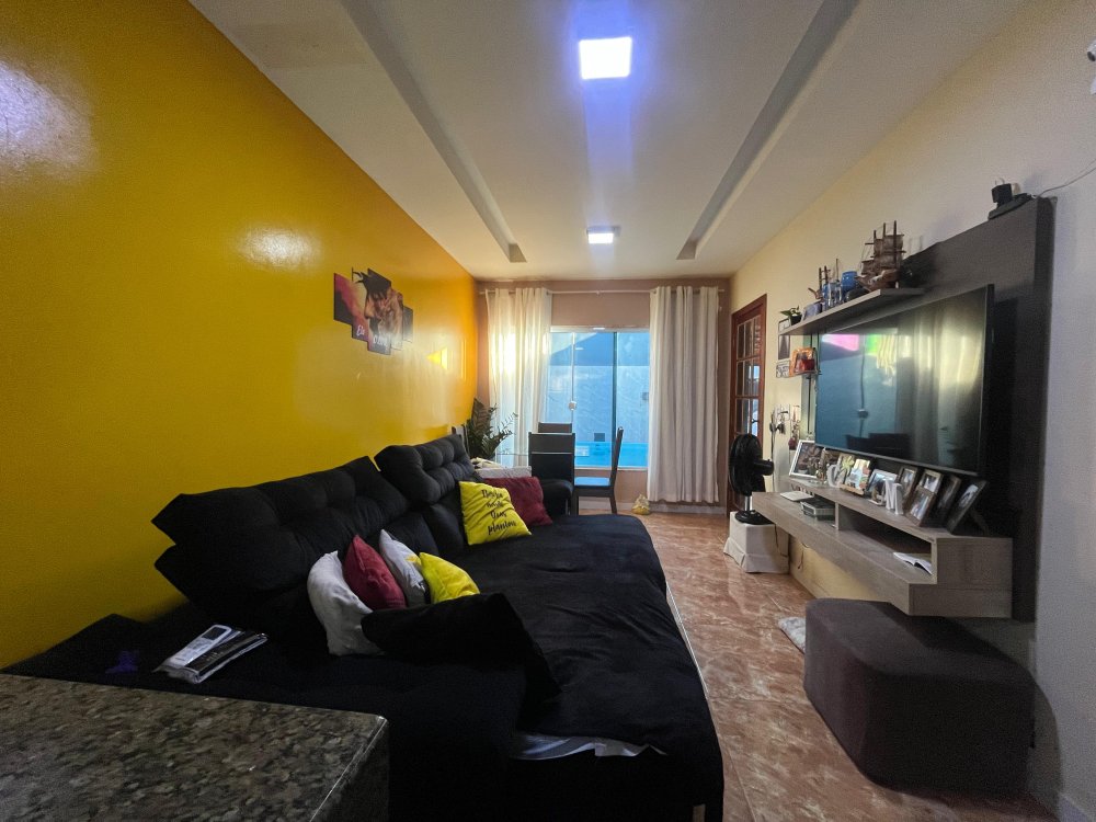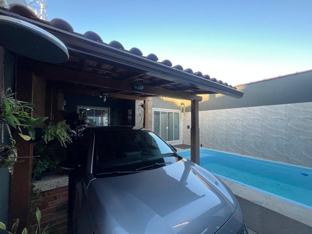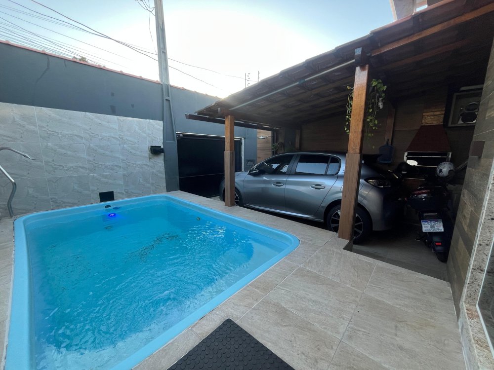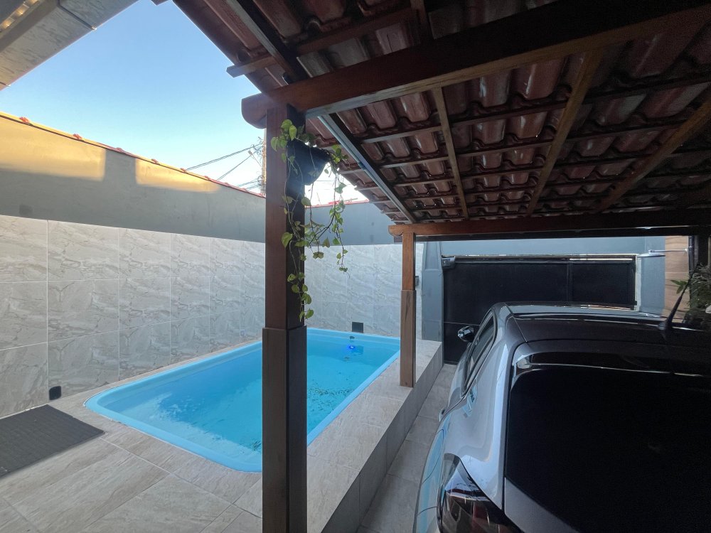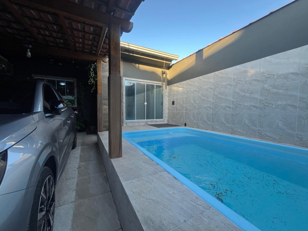 Contém dois quartos, sala, cozinha, banheiro social, área de serviço, área gourmet com piscina e garagem.